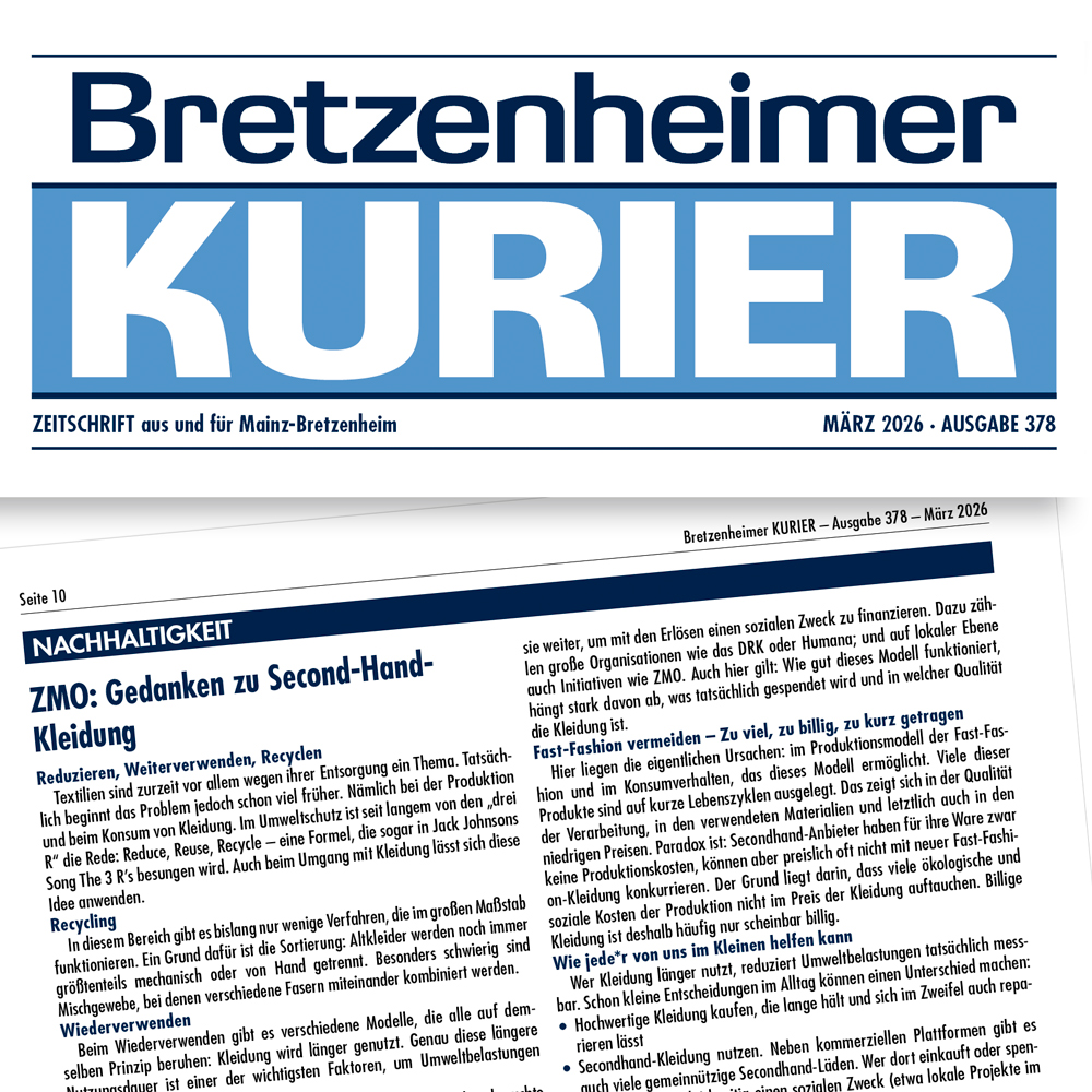 Eine weitere Form der Wiederverwendung sind Kleiderkammern und Charity-Secondhand-Läden. Sie sammeln Kleidung, bereiten sie auf und verkaufen sie weiter, um mit den Erlösen einen sozialen Zweck zu finanzieren. Dazu zählen große Organisationen wie das DRK oder Humana; und auf lokaler Ebene auch Initiativen wie ZMO in Mainz-Bretzenheim. Auch hier gilt: Wie gut dieses Modell funktioniert, hängt stark davon ab, was tatsächlich gespendet wird und in welcher Qualität die Kleidung ist.